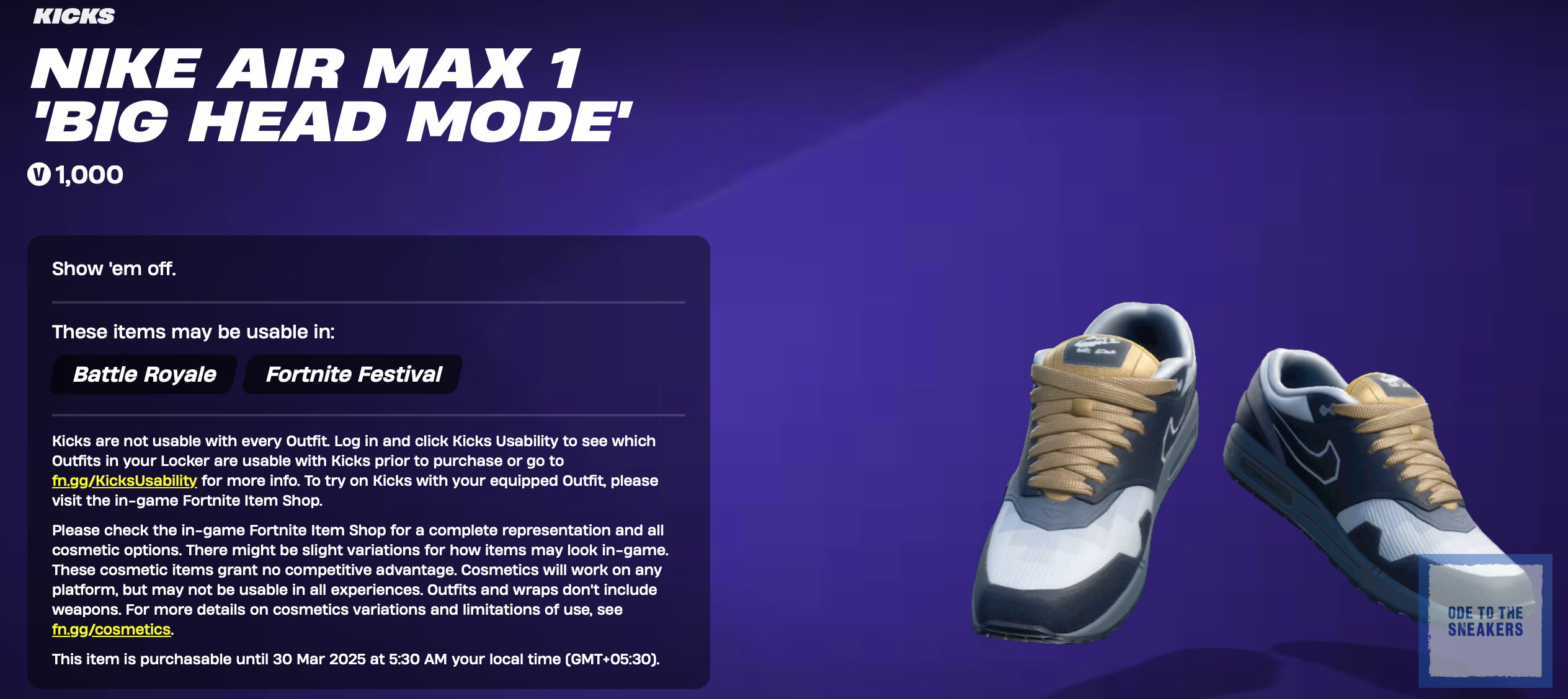 Nike Air Max 1 Big Head Mode is already available for purchase in Fortnite Item Shop and the physical sneaker version is expected to launched in Q2 Summer of 2025.